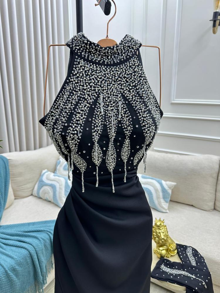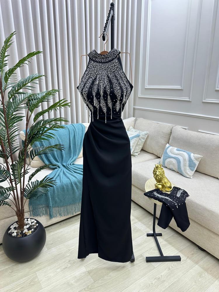 فساتين طويله يمنحك إطلالة فاخرة بتصميم أنثوي يعكس الجمال والرقي، مصنوع بعناية مع تطريز يدوي يضيف طابعاً فنياً مميزاً. بدون أكمام ليمنحك مظهراً أكثر نعومة وأناقة، مثالي للمناسبات التي تتطلب حضوراً متألقاً ولافتاً للأنظار.